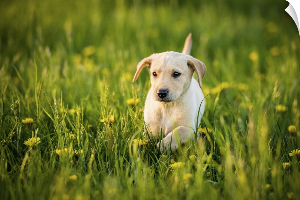 <p>Golden Labrador Puppy running through a field of daisies, United Kingdom, Europe</p>