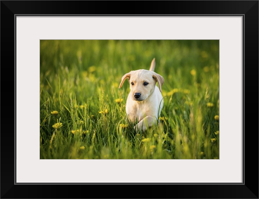 <p>Golden Labrador Puppy running through a field of daisies, United Kingdom, Europe</p>