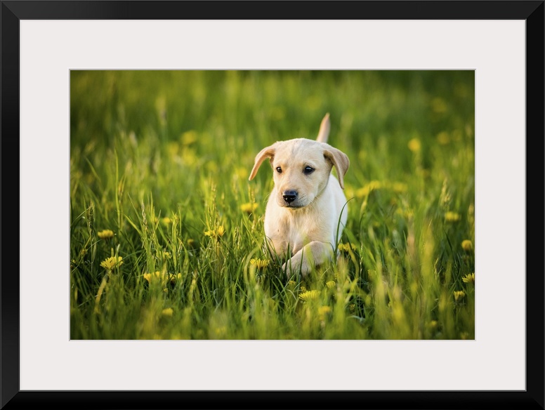 <p>Golden Labrador Puppy running through a field of daisies, United Kingdom, Europe</p>