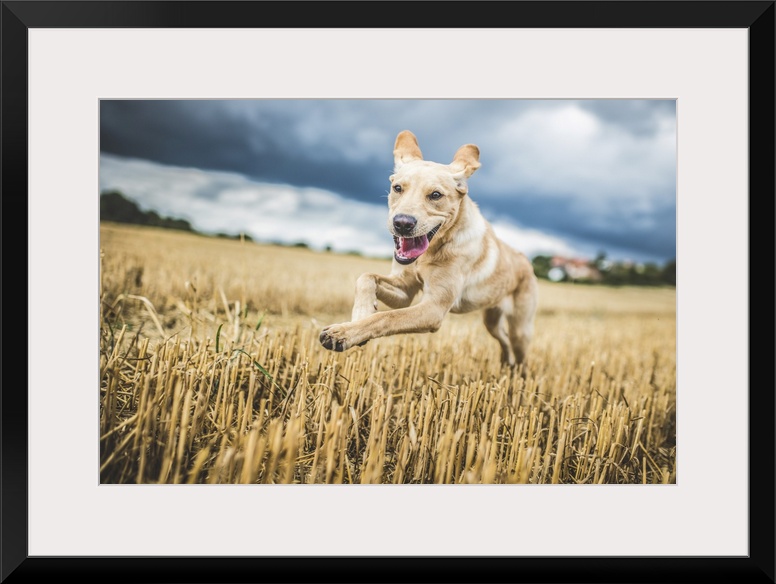 <p>Golden Labrador running through a field of wheat, United Kingdom, Europe</p>