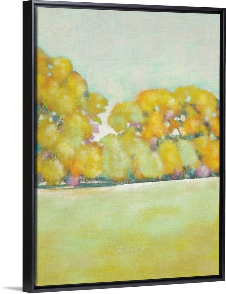 <p>Contemporary landscape art print of yellow trees at the edge of an open field.</p>