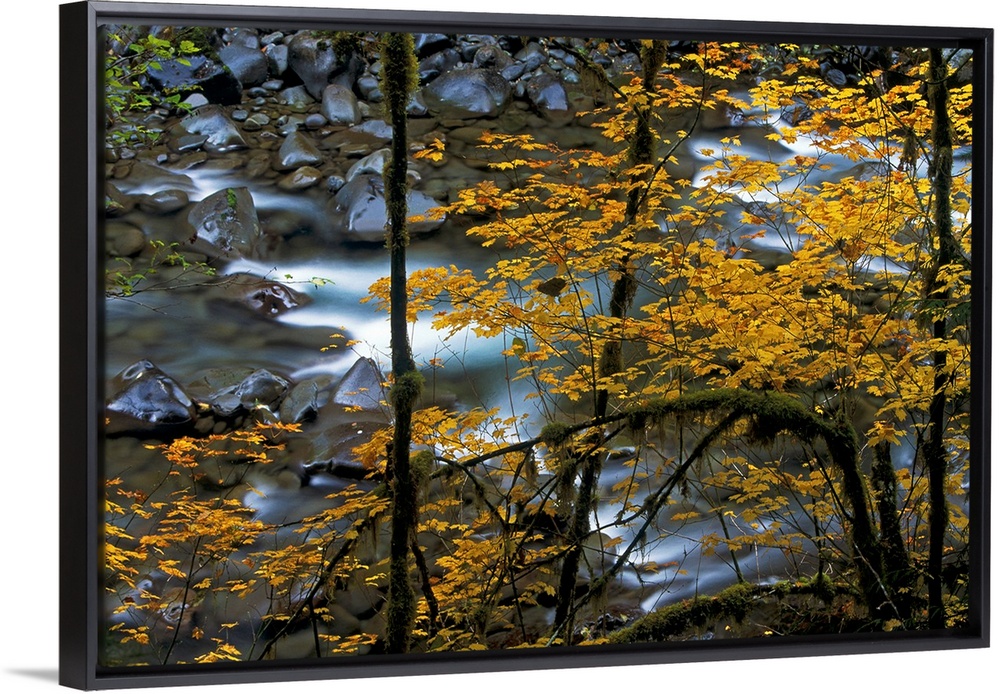 <p>Wall docor of a long exposure of river rapids provides a pleasing backdrop to the soft yellows of vine maples in Washington State.</p>