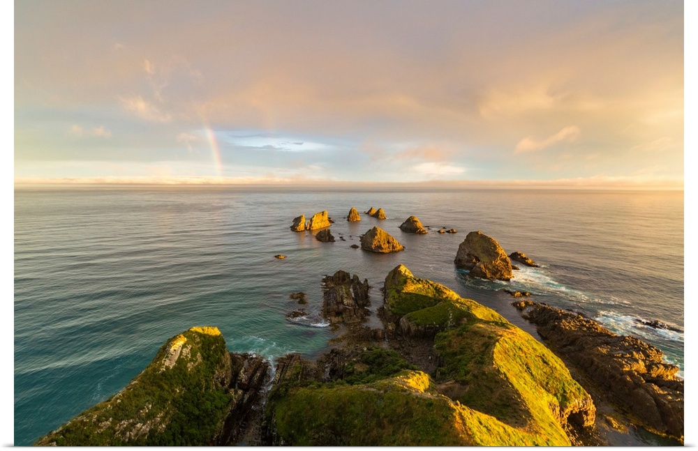 <p>Golden light on The Nuggets islands and rainbow in the sky at Nugget Point. Ahuriri Flat, Clutha district, Otago region, South Island, New Zealand.</p>