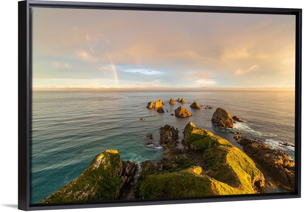 <p>Golden light on The Nuggets islands and rainbow in the sky at Nugget Point. Ahuriri Flat, Clutha district, Otago region, South Island, New Zealand.</p>