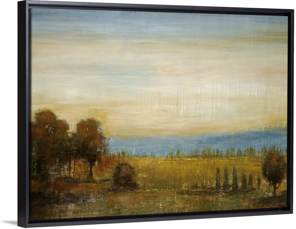 <p>Painting on canvas of a field with a bunch of trees and a rolling hill in the distance.</p>