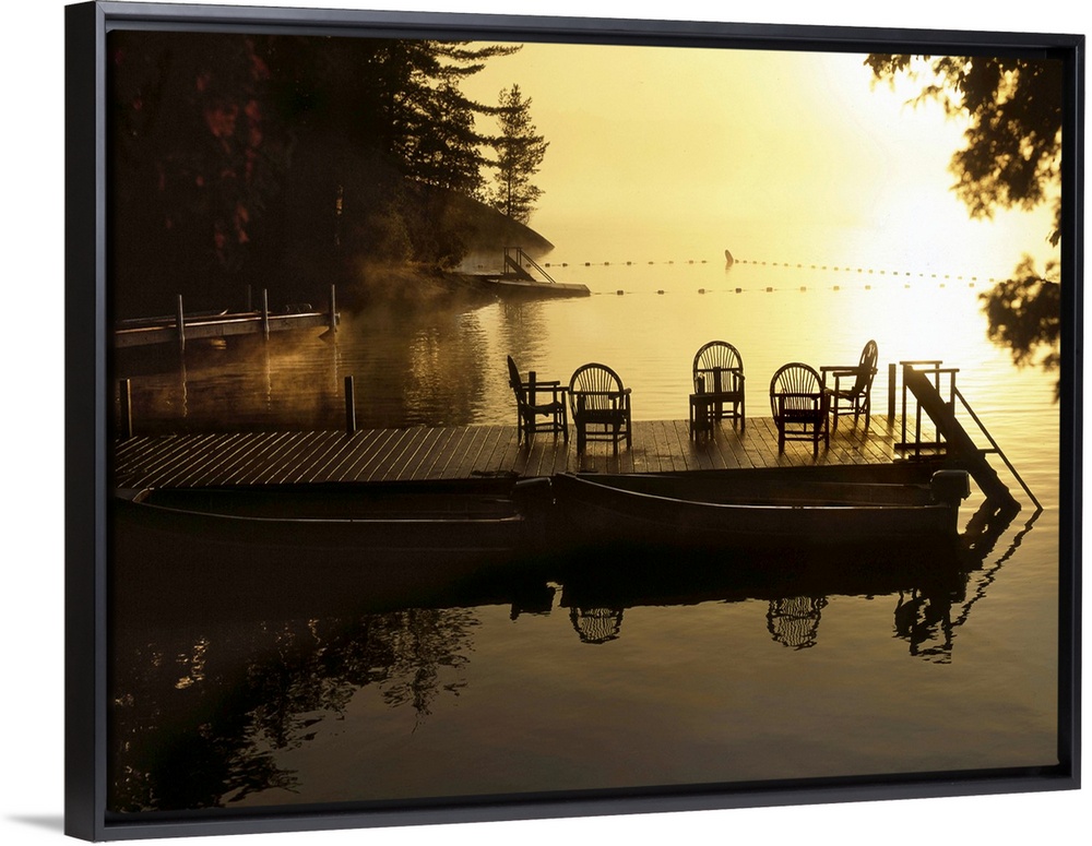 <p>Sunsetting over a golden lake with a timber jetty with chairs</p>