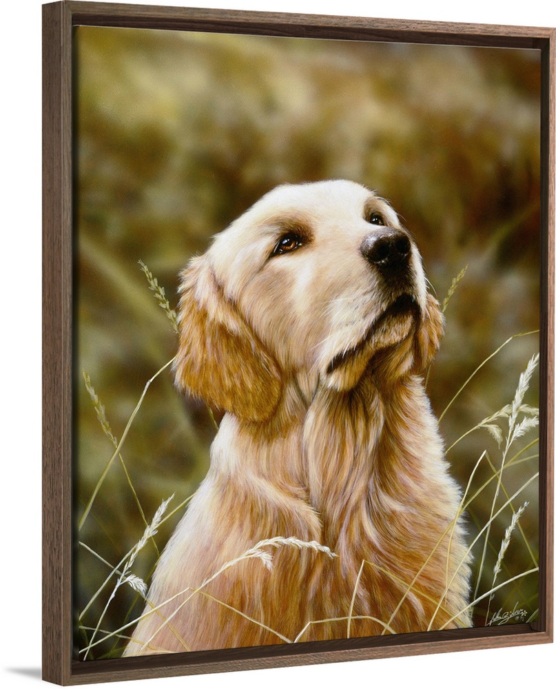 <p>Contemporary painting of a golden retriever sitting and looking up at something.</p>