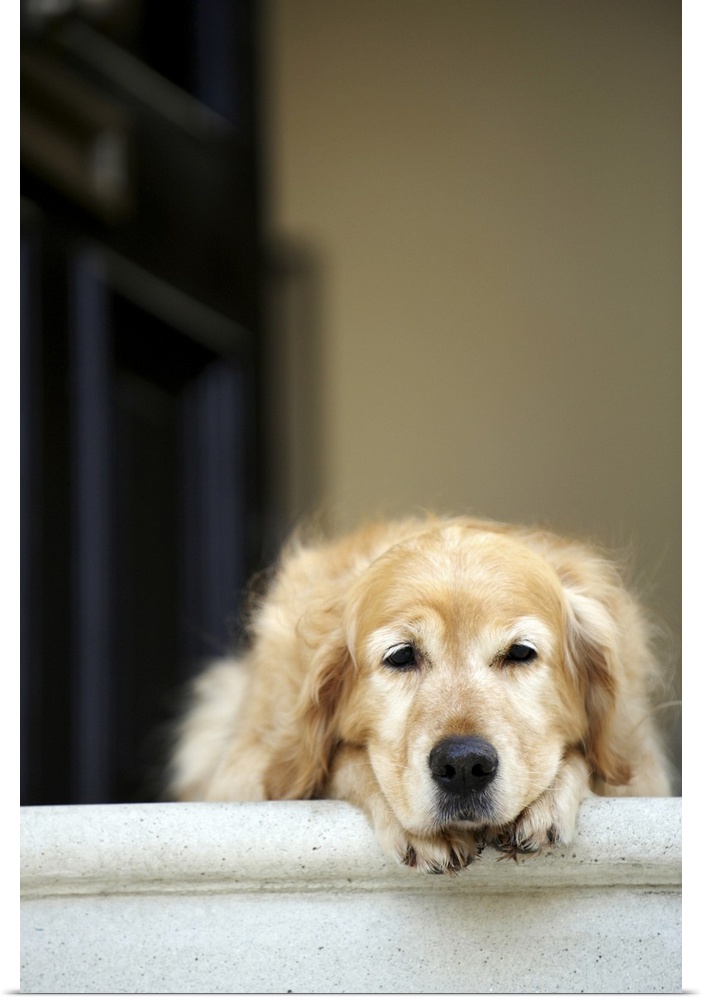 <p>Golden retriever dog lying in front door of house, looking away (focus on foreground)</p>