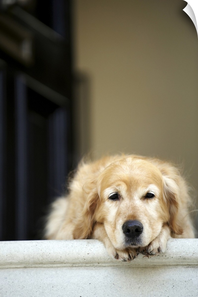 <p>Golden retriever dog lying in front door of house, looking away (focus on foreground)</p>