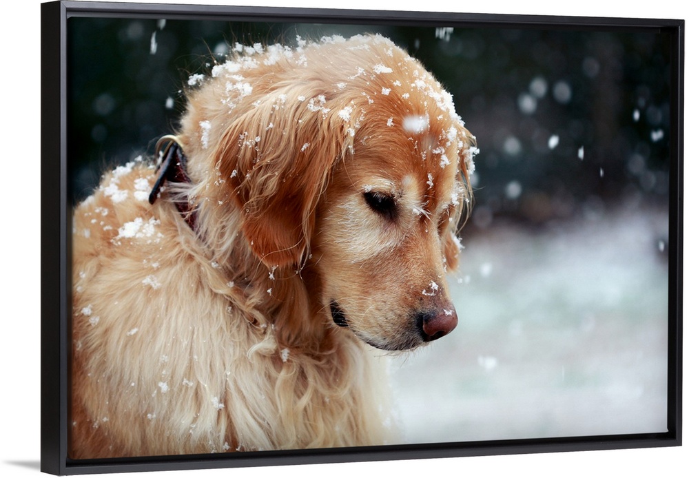 <p>Close up of a Golden Retriever dusted by snowflakes, watching the gently falling snow in late Winter.</p>