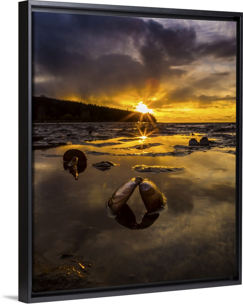 <p>Golden sunlight illuminates the sky at sunset and reflects in the shallow waters along the coastline with an open clam shell in the foreground; Vancouver, British Columbia, Canada</p>