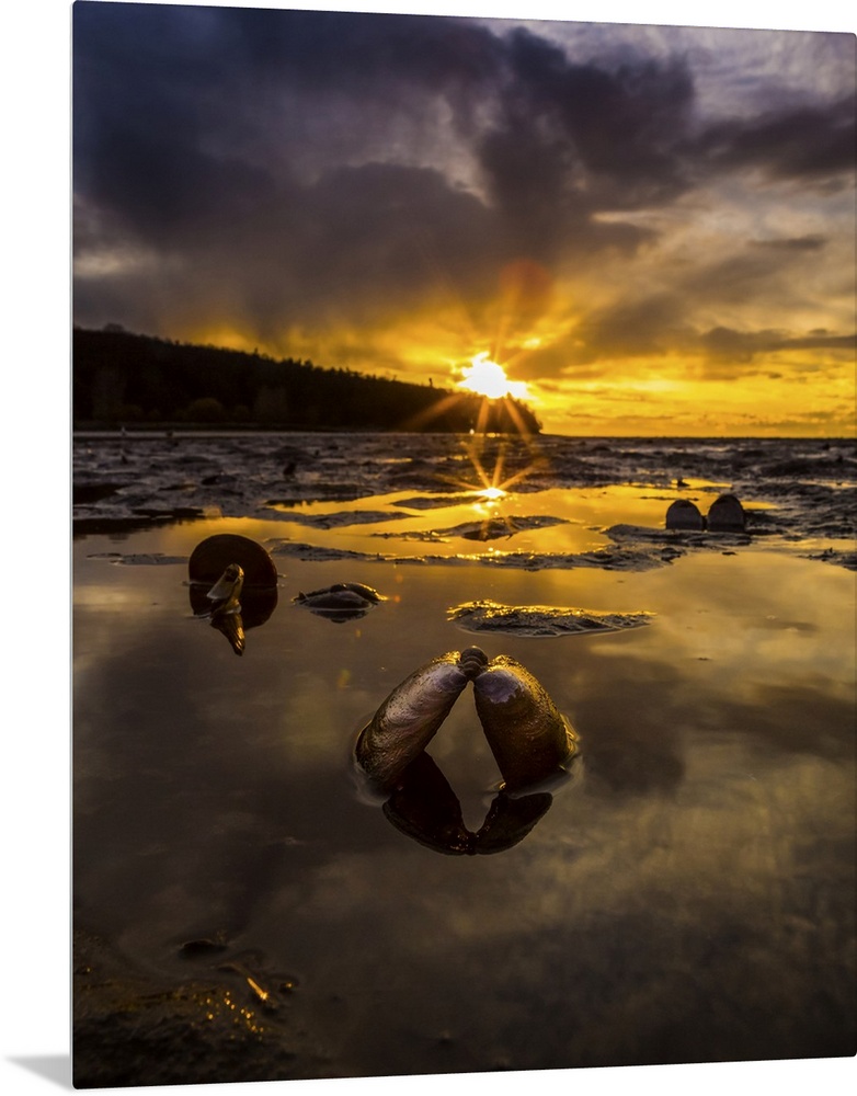 <p>Golden sunlight illuminates the sky at sunset and reflects in the shallow waters along the coastline with an open clam shell in the foreground; Vancouver, British Columbia, Canada</p>