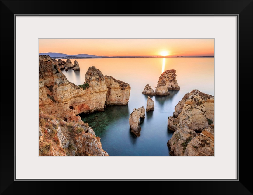 <p>Golden sunrise on the red cliffs of Ponta da Piedade Lagos Algarve Portugal Europe.</p>