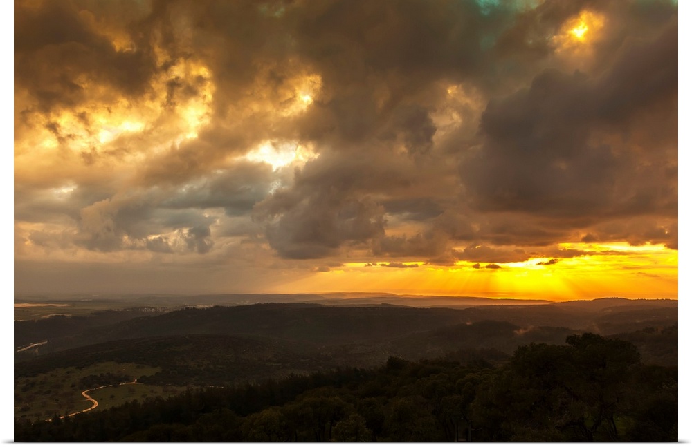 <p>Golden sunset with glowing clouds and silhouetted landscape. Israel.</p>