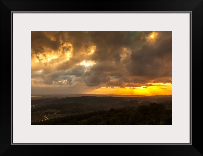<p>Golden sunset with glowing clouds and silhouetted landscape. Israel.</p>