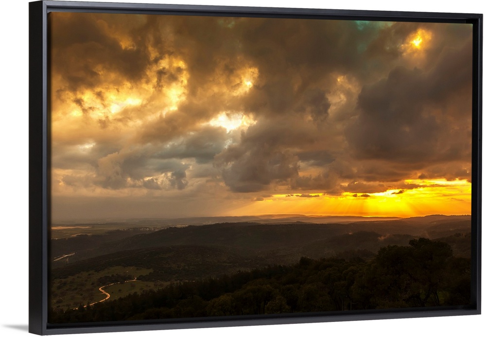 <p>Golden sunset with glowing clouds and silhouetted landscape. Israel.</p>