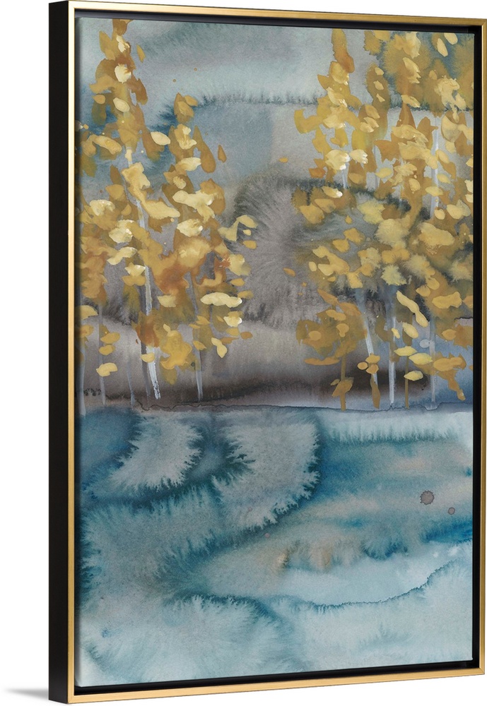 <p>Abstract watercolor landscape in blue and gray with golden trees.</p>