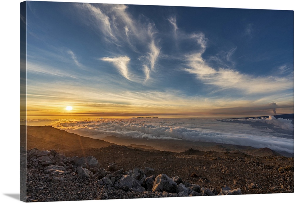 <p>Spectacular scene of the golden twilight above the clouds at Mauna Kea with view of the smoke from 2022 eruption of Mauna Loa Volcano (Moku'?weoweo, the world's largest active volcano) on the Big Island of Hawaii, Island of Hawaii, Hawaii, United States of America</p>