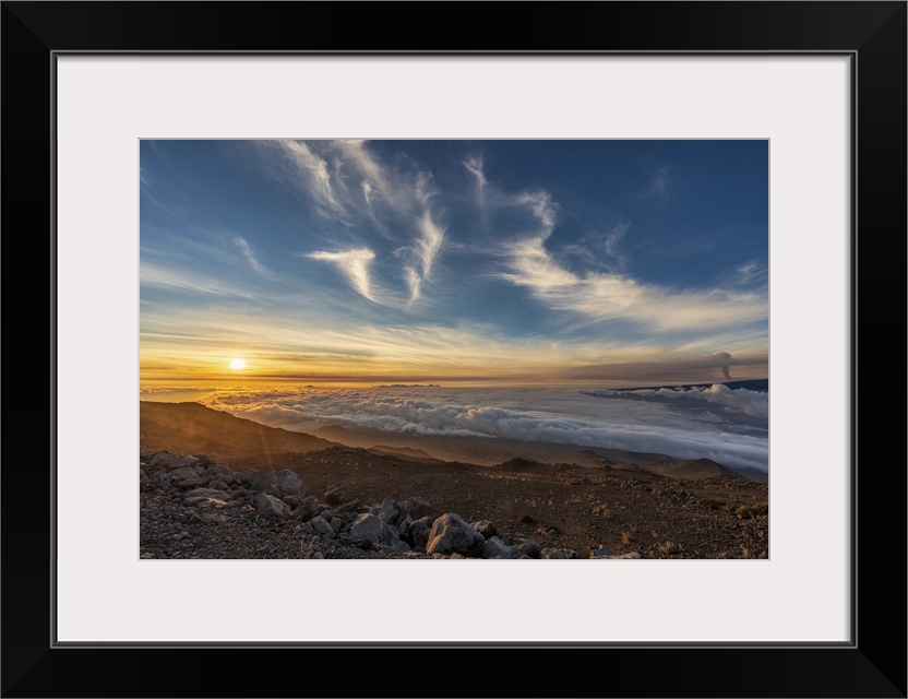 <p>Spectacular scene of the golden twilight above the clouds at Mauna Kea with view of the smoke from 2022 eruption of Mauna Loa Volcano (Moku'?weoweo, the world's largest active volcano) on the Big Island of Hawaii, Island of Hawaii, Hawaii, United States of America</p>