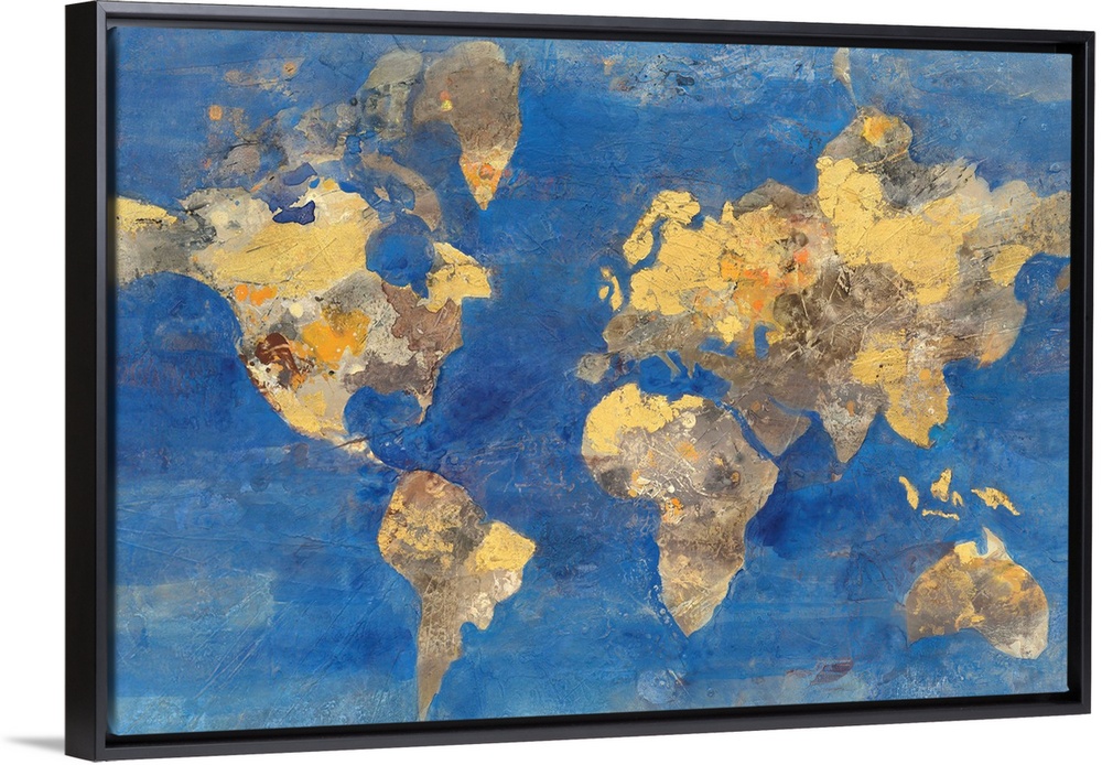 <p>A map of the world in golden tones with a deep blue ocean.</p>