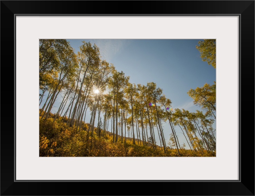 <p>Golden, yellow quaking aspens (Populus tremuloides) in a row along the mountainside against a bright blue sky with the sun shining through the trees in autumn, Yellowstone National Park, Wyoming, United States of America</p>
