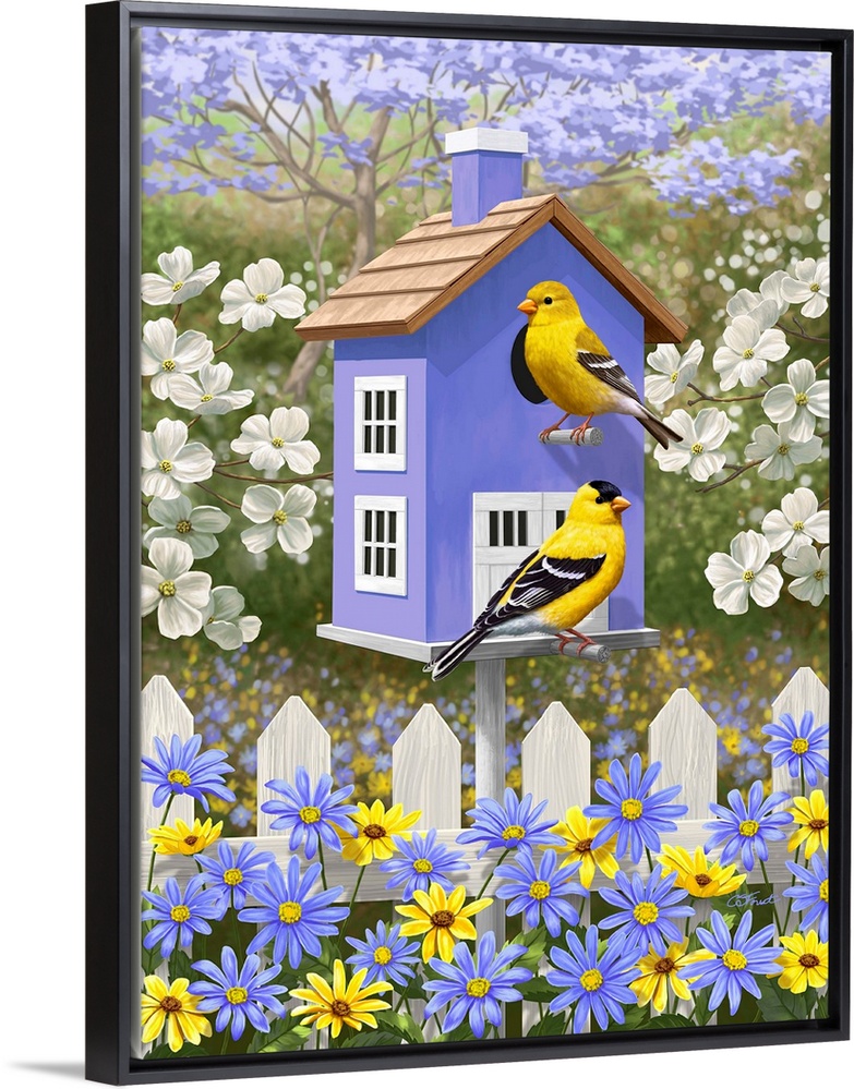 <p>Goldfinches perched on a lavender birdhouse.</p>