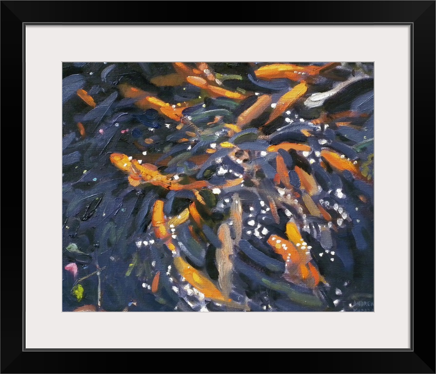 <p>This contemporary artwork is of goldfish swimming near the surface of a pond.</p>