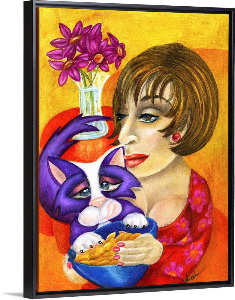 <p>Contemporary artwork in the style of cubism of a woman with a cat in bold colors.</p>