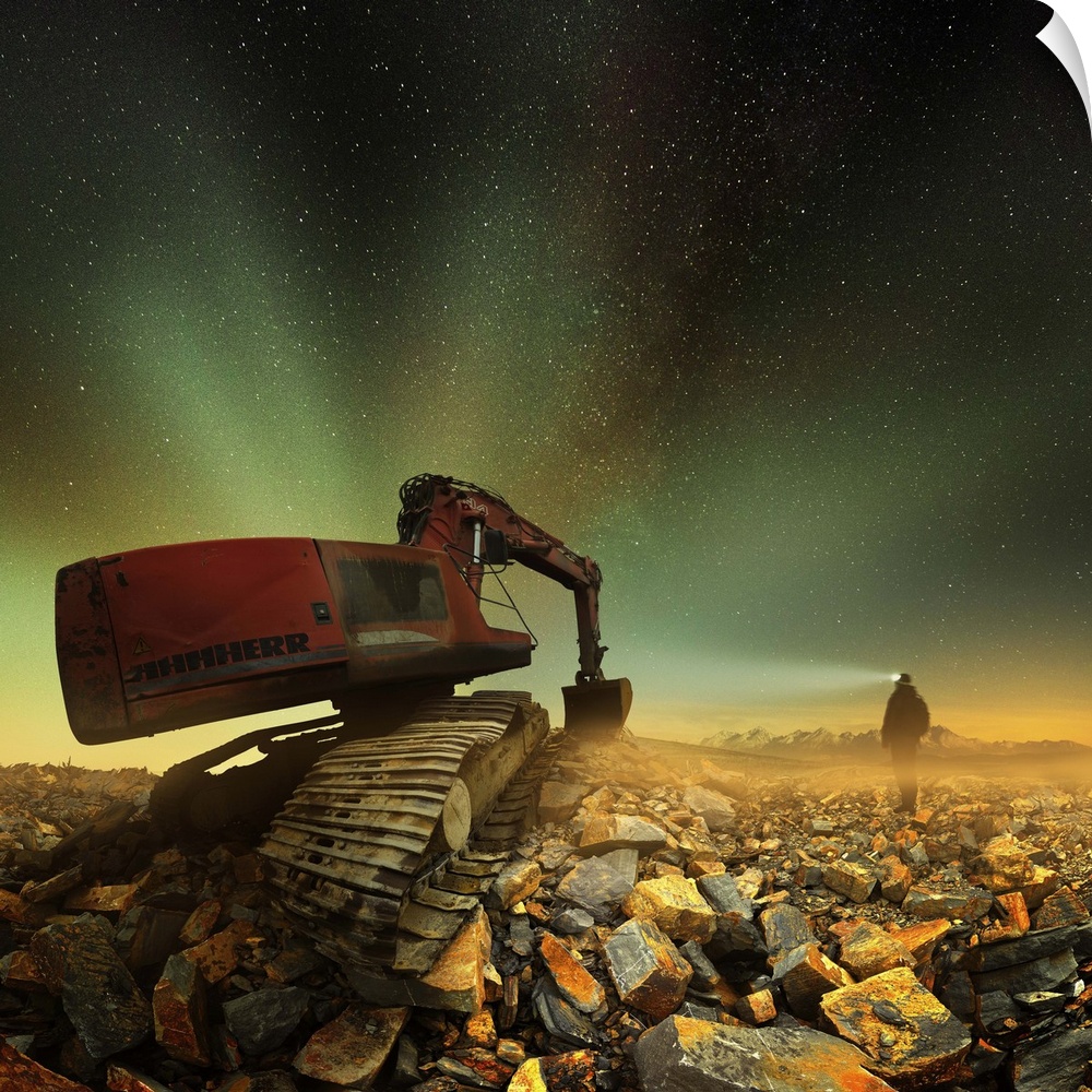 <p>An excavator on a pile of rocks under a starry sky, Slovakia.</p>