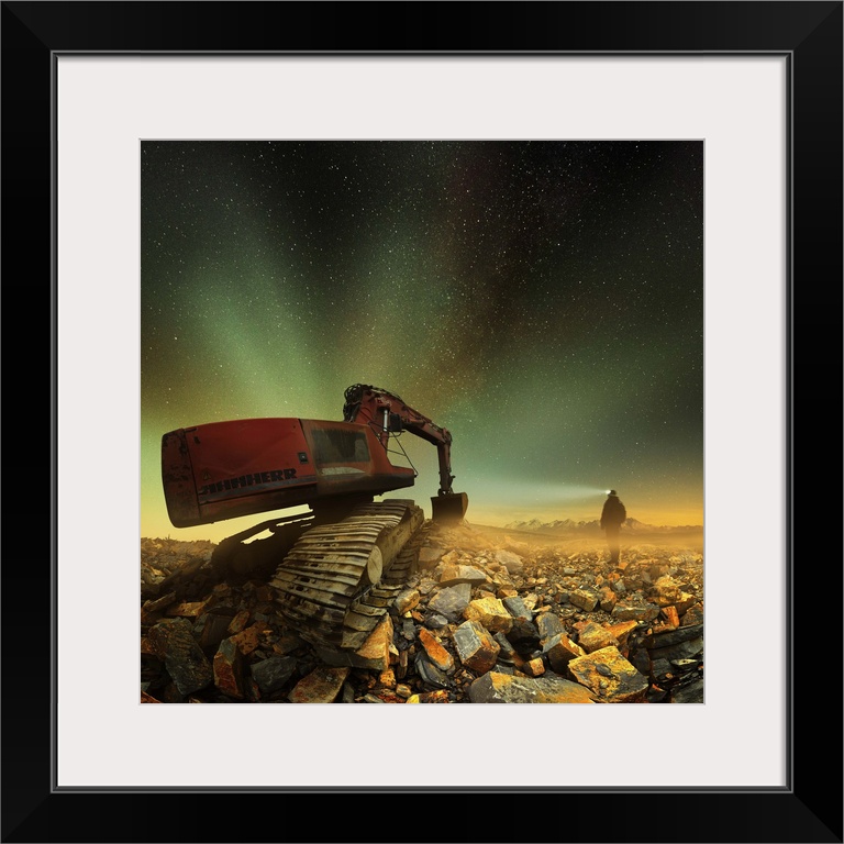 <p>An excavator on a pile of rocks under a starry sky, Slovakia.</p>