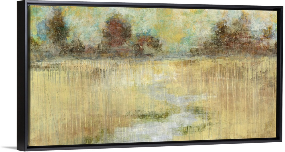 <p>Landscape, large artwork for a living room or office in golden tones. A small river winds through a landscape with large trees in the background.</p>