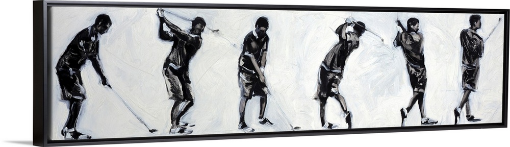 <p>Wide, black and white figurative painting on large canvas of a male figure illustrating six different positions of a swing with a golf club, Painted with swirling brushstrokes on a plain background.</p>