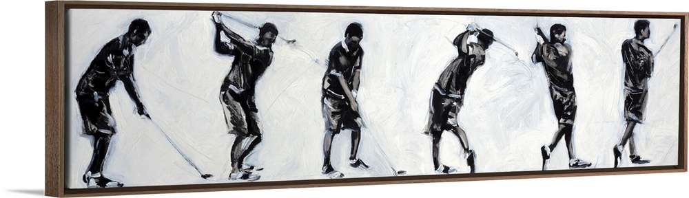 <p>Wide, black and white figurative painting on large canvas of a male figure illustrating six different positions of a swing with a golf club, Painted with swirling brushstrokes on a plain background.</p>