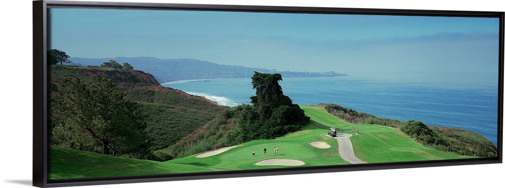 <p>This wall hanging is a panoramic photograph of a golf green overlooking the ocean from the top of a hill.</p>