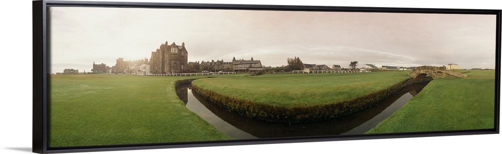 <p>Large fish-eye panoramic photo of the St. Andrews golf course with the magestic stone club house in the background.</p>