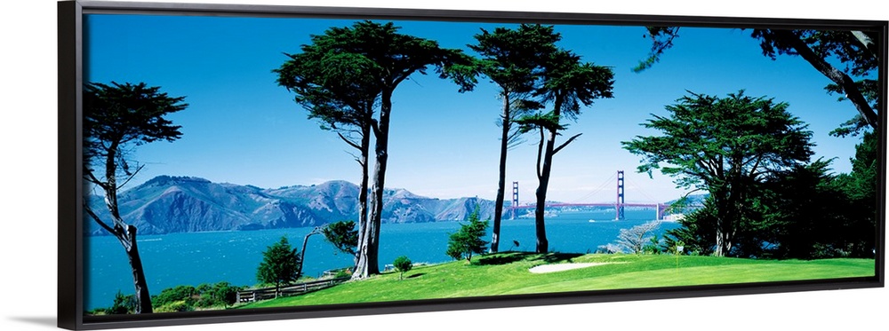 <p>Big panoramic photograph of a seaside golf course in San Francisco, California (CA) with mountains and the Golden Gate Bridge visible in the background.</p>