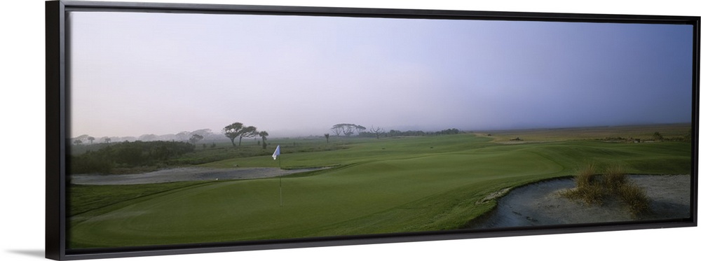 <p>Giant landscape photograph of a flag surrounded by the rolling greens on Ocean Golf Course, beneath a hazy blue sky on Kiawah Island, South Carolina.</p>
