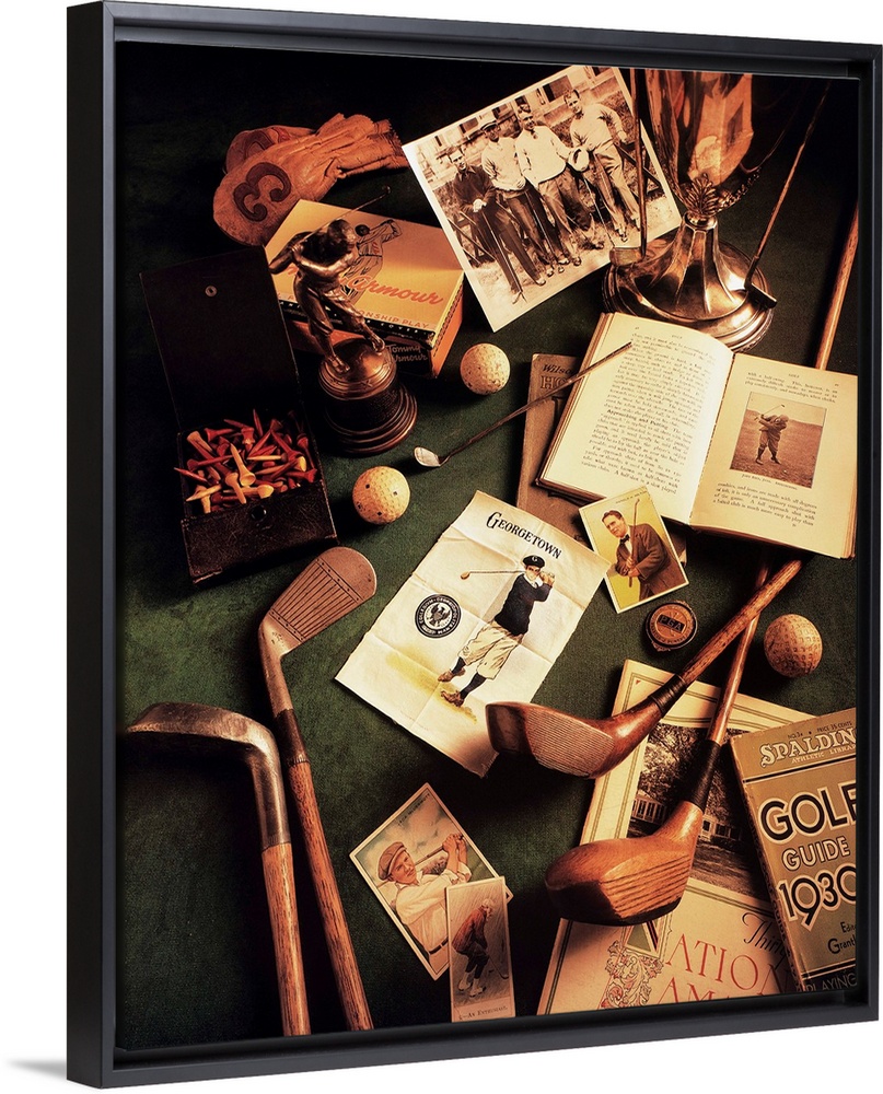 <p>Photograph of vintage golf gear and memorabilia.</p>