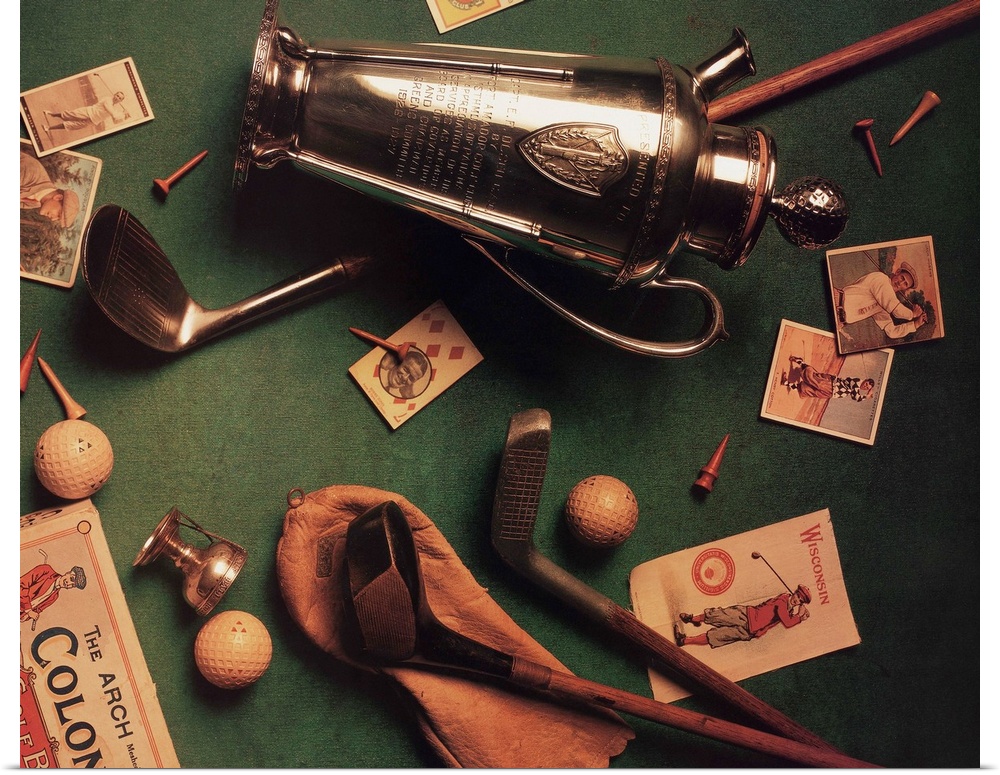 <p>Photograph of vintage golf gear and memorabilia.</p>