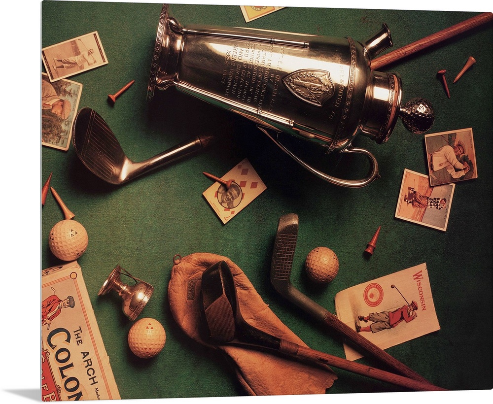 <p>Photograph of vintage golf gear and memorabilia.</p>