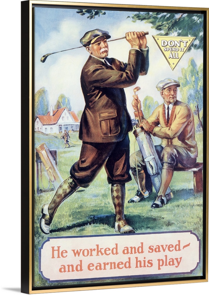 <p>Old inspirational print of two golfers on the greenway with the text "He worked and saved - and earned his play."</p>