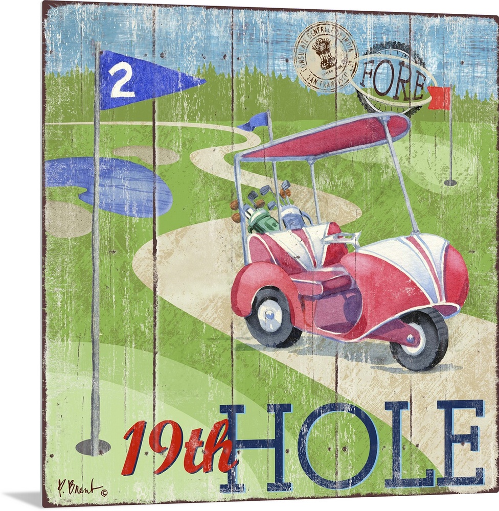 <p>Fun golf decor with a golf cart on a course with a wooden board effect.</p>