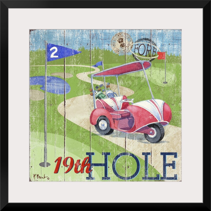 <p>Fun golf decor with a golf cart on a course with a wooden board effect.</p>