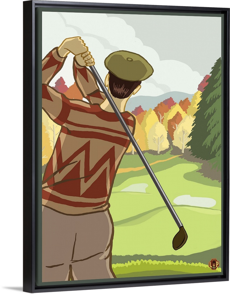 <p>Retro stylized art poster of a golfer making a shot on a golf course.</p>