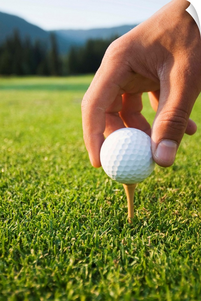 <p>Golfer sets up a ball on the tee of a golf course on a summer evening; Whistler, British Columbia, Canada</p>
