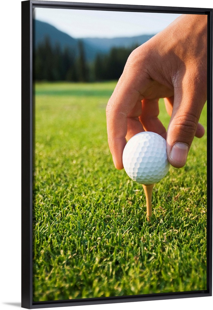 <p>Golfer sets up a ball on the tee of a golf course on a summer evening; Whistler, British Columbia, Canada</p>