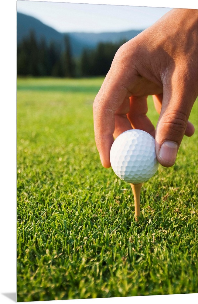 <p>Golfer sets up a ball on the tee of a golf course on a summer evening; Whistler, British Columbia, Canada</p>
