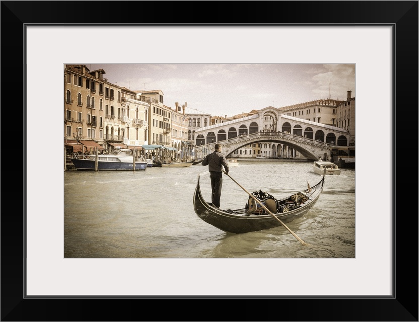 <p>Gondola at the Rialto Bridge on the Grand Canal, Venice, Veneto, Italy.</p>