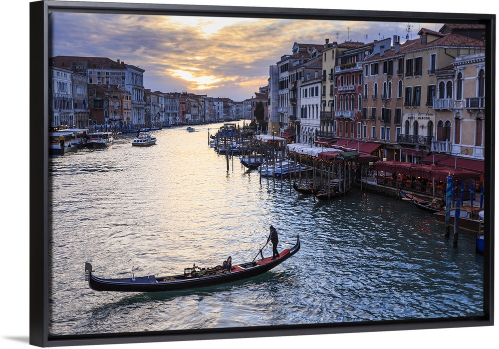 <p>Gondola on the Grand Canal at sunset in winter, from Rialto Bridge, Venice, Veneto, Italy</p>
