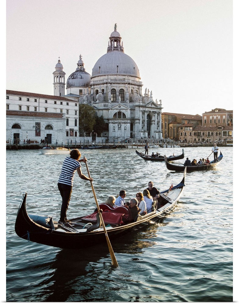 <p>Photograph of gondolas rowing in front of Santa Maria della Salute in Venice.</p>